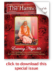 It is with a desire to propagate the sublime glories of the concluding transcendental pastimes of our most worshipful Srila Gurudeva, nitya-lila pravista om visnupada Sri Srimad Bhaktivedanta Narayana Gosvami Maharaja, that we humbly present Entering Nitya-lila, a special on-line edition of the Rays of The Harmonist (No.24) in honour of the New Braja (Badger) puspa-samadhi ceremony, 2011.This special edition of Rays of The Harmonist includes:
