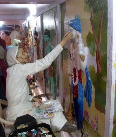 Dandavat pranama. All glories to Sri Sri Guru and Gauranga. Today is the sixth day of Vraja Mandala Parikrama led by Srila Narayana Maharaja. Every day the over 500 assembled devotees (with more arriving everyday) are led on parikrama to holy pastime places and temples in Vrndavana. In the evenings Srila Maharaja has been telling the glories of the pastime places that were visited that day and also has speakers explain the verses of Nectar of Instruction by Srila Rupa Gosvami. Srila Maharaja explained that if we do not know and follow the instructions of Srila Rupa Gosvami in his Nectar of Instruction and Srila Raghunatha das Gosvami in his Sri Manah-siksa then we cannot understand the glories of the pastimes of Srimati Radhika and Sri Krsna in Vrndavana. A few days before the parikrama began, Srila Narayana Maharaja ordered Syamarani dasi and a team of artists to paint the bas reliefs (sculptures) of Govardhana-lila that are in the entrance and the back wall of the new Sri Giriraja Govardhana temple. Last year the artists drew black and white line drawings for the sculpturer to follow and now about 20 devotees are painting them and assisting in the project. The paintings need to be complete by Nov. 7th before the parikrama party moves to Govardhana for 19 days (November 10-29). On November 27th and 28th Srila Maharaja will be installing the Deities of Sri Radha-vinode-bihari, Sri Caitanya Mahaprabhu and Sri Giriraja Govardhana. Due to the intense schedule of finishing these 32 paintings in such a short time, we will be unable to send out any lectures of Srila Maharaja until after November 10th. Please forgive us for this and we hope that you will accept these pictures of the parikrama and bless us that we can continue to send lectures and photos in a timely manner. Your aspiring servants, Anita, Syamarani and Vasanti dasis ![]() Evening class in the pandal at Gopinath bhavan in Vrndavana Syamarani dasi painting Sri Balarama prabhu ![]() Artists painting the back wall of the Govardhana temple. On the back wall are Dasa-avatara (the 10 incarnations of Sri Krsna), boat pastime of Krsna taking the gopis across Manasi Ganga, Holi and Rasa-lila. ![]() Sri Rupa-Sanatana Gaudiya Math, one of the temples visited on parikrama and built by Srila Maharaja and his followers. Sri Radha-vinode-bihari and Sri Caitanya Mahaprabhu (middle), Srimati Vrnda-devi (right) and Srila Bhaktiprajnana Kesava Gosvami Maharaja (left). Srimati Vrnda-devi is only present in two temples; this temple and also in the forest of Kamyavana. ![]() Seva Kunja painting which is worshipped in its own altar on the 2nd floor of Sri Rupa Sanatana Gaudiya Matha. |