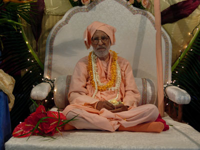 On February 8, 2005, over 400 devotees from around the world celebrated Srila Narayana Maharaja's Appearance Day with him in Hilo, Hawaii. Srila Narayana Maharaja came to the festival site in the morning, and for over an hour the devotees lined up to approach him on the vyasasana, to offer him flowers, presents and heartfelt prayers. Some of the devotees on the line handed him cell phones, and thus Srila Maharaja also spoke with many devotees from around the world on the phone during that hour. He then spoke for about 15 minutes about the significance of Vyasa Puja, at which time he explained that he was offering the devotees offerings to the lotus feet of his Gurudeva, Srila Bhaktiprajnana Kesava Gosvami Maharaja and his guru-parampara. After his short talk, he performed arati, worshiping the parampara.