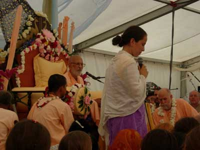 Srila Narayana Maharaja called on his spiritual daughter, Sita Thakurani dasi (one of the leaders of the Gangamata Temple in London) to explain the verse beginning, “nanopacara-krta-pujanam arta-bandhoh…,” quoted by Sri Raya Ramananda to Sri Caitanya Mahaprabhu. After Sita dasi spoke, Srila Narayana Maharaja said, “I fear that she may take the position of Syamarani. If women are not intelligent, how could she speak like this? Although she is a baby (young), she is speaking like this. I want all my daughters to be like her – very bold.