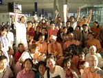 On the evening of July 1st about 30 devotees, led by Krsna dasa brahmacari, went on harinama-sankirtana in one of the busiest shopping districts of Hong Kong. The streets were full with thousands of people because it was Independence Day. When they saw and heard the harinama party, they became extremely enlivened. They began dancing with the devotees and took pictures.