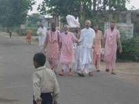 The atmosphere in Govardhana was very peaceful and serene. The temple is spacious and the air in Govardhana is clean. Every morning Srila Narayana Maharaja would go for a 45 minute walk, and then informally speak with devotees while walking back to his room. Also on the way to his room, he would enter the temple and offer respects to the beautiful deities – Sri Giriraja Govardhana, Sri Caitanya Mahaprabhu, Sri Sri Radha-Vinoda-bihariji, and to his Guru Maharaja, Srila Bhaktiprajnana Kesava Gosvami Maharaja.