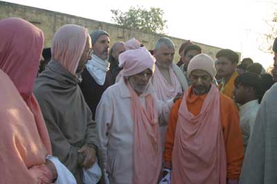 MARCH, 2007 After the completion of Navadvipa-dhama parikarma, Srila Narayana Maharaja returned to his Giridhari Gaudiya Matha in Govardhana, where he will remain until March 25th. He will then spend three days in Mathura to celebrate Rama-navami, and then proceed to Delhi (Noida) for a 3-day pandal program before leaving for his Western tour. Every morning at about 6am he goes for a morning japa walk, during which time he also answers devotees' philosophical questions, and he returns at 7:00am. He then enters the temple and circumambulates the Deities of Sri Sri Radha-vinoda-bhiharji and Sri Caitanya Mahaprabhu, and the assembled devotees circumambulate with him. ![]() Morning walk ![]() Circumambulating the Deities ![]() Sri Sri Radha-vinoda-bihariji and Sri Caitanya Mahaprabhu ![]() Obeisances to Their Lordships During the day, Srila Narayana Maharaja translates the acaryas' Sanskrit commentaries of Srimad-Bhagavatam into Hindi, answers numerous letters, and meets with devotees. He was invited one day to a nearby village named Shonk to speak about the Gaudiya-Vaisnava philosophy, and he also initiated 30 villagers there. On another day he went to Vrndavana, to visit his Sri Rupa Sanatana Gaudiya Matha and Gopinath Bhavan. While at Sri Rupa Sanatana Gaudiya Matha, he spoke for a fe w minutes in English. The following is a transcription of that short talk: Do not commit any offense towards the holy dhama. Also, do not criticize any Vaisnava. Perform bhajana. "This place is very sacred. Srila Rupa Gosvami, Srila Sanatana Gosvami, Srila Lokanatha Gosvami, Srila Bhurgarba Gosvami, Srila Gopal-bhatta Gosvami, Srila Jiva Gosvami and the other Gosvamis, Srila Krsnadasa Kaviraja Gosvami, Srila Visvanatha Cakravarti Thakura and Sri Baladeva Vidyabhusana have performed bhajana here and are eternally present in Seva Kunja. And some special Gaudiya Vaisnava temples are here. You are very fortunate to be here. Be surrendered to Srila Gurudeva and Sri Sri Radha-Krsna. "Be careful. Be wholeheartedly surrendered to Gurudeva and Radha-Krsna conjugal. What I have told in my classes about your aim and object of your life, you should realize here. tan-nama-rupa-caritadi-sukirtananu- smrtyoh kramena rasan a-manasi niyojya tisthan vraje tad-anuragi jananugami kalam nayed akhilam ity upadesa-saram [While living in Vraja as a follower of the eternal residents of Vraja who possess inherent spontaneous love for Sri Krsna, on should utilize all his time by sequentially engaging the tongue and the mind in meticulous chanting and remembrance of Krsna's names, form, qualities and pastimes. This is the essence of all instruction. (Sri Upadesamrta, verse 8)] "You have heard this verse many times. Try to follow it. It is a very important verse. It is the essence of all instructions of Sri Caitanya Mahaprabhu and Srila Rupa Gosvami. "I am also fortunate that I am here in Vraja. Sometimes I am here, sometimes in Mathura, sometimes in Govardhana, sometimes in Navadvipa, and sometimes in Radha-kunda. Perform bhajana very sincerely and try to be totally surrendered, with no duplicity or hypocrisy, and thus your lives will be successful." Every evening at Govardhana, at about 5:30pm, Srila Narayana Maharaja walks on the grass while intermittently doing his japa and meeting with devotees and guests. During this 30 minute period, devotees sit on the ledges and temple steps to chant along with him. Most evenings, after this japa period, he gives short classes in the temple room. One night he spoke about the discussion between Nemi Maharaja and the Nine Yogendras concerning the process by which conditioned souls can attain liberation and ultimately Krsna-prema. One night he spoke about the significance of the Holi festival. On the night following the solar eclipse, which had taken place between 6.28am and 9.55 am, he spoke about the significance of the solar eclipse. He related the history of Krsna and His associates performing pastimes at the time of the eclipse at Kuruksetra, 5,000 years before. ![]() ![]() Walking from his room to the garden ![]() Japa walk in the garden Report submitted by Vasanti dasi Editor: Syamarani dasi Editorial Advisors: Sripad Brajanath dasa Pictures submitted by Subal Sakha dasa