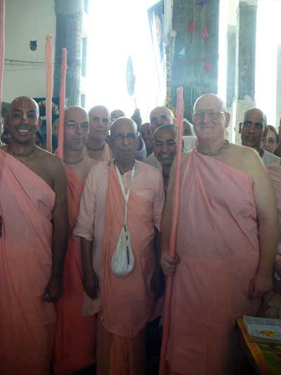 Srila Narayana Maharaja then asked who is senior (according to the date of their diksa initiation) amongst the three sannyasi candidates: Bhagavata dasa, Jayanta-krsna dasa, and Janardana dasa. He then called on them to stand up, one by one, according to seniority. He first called Sripad Bhagavat dasa vanacari, a senior disciple of Srila Prabhupada Bhaktivedanta Swami Maharaja, and said: